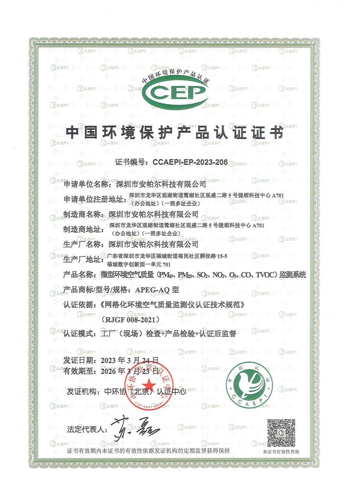 中國環(huán)境保護產(chǎn)品認(rèn)證證書 APEG-AQ
