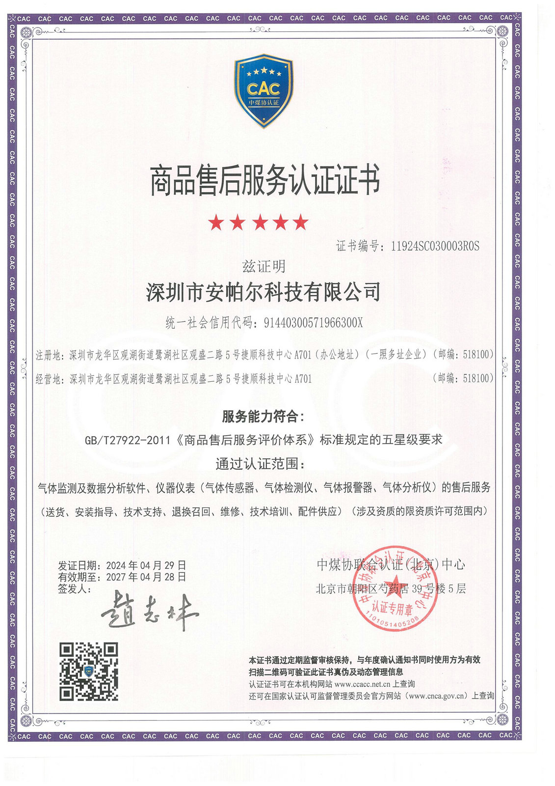 售后服務認證證書