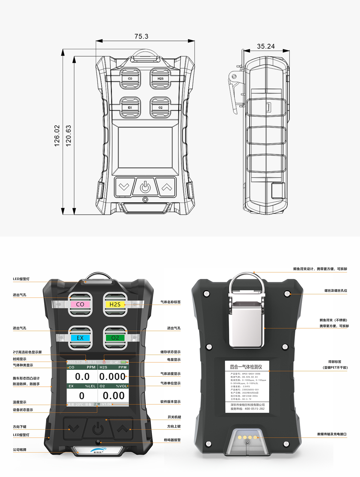 ☆  高清彩色液晶實時顯示。可顯示檢測數據、報警信息、時間、溫度、濕度、存儲、通信、電量、充電狀態等信息,無背光下仍可見顯示信息;